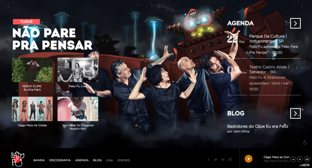O site foi desenvolvido para divulgar o novo Álbum da banda Pato Fu, Não pare pra pensar. Neste projeto trabalhei tanto no desenvolvimento do sistema, quanto na interface. O grande desafio foi criar um site dinâmico e interativo, contando a história da banda e divulgando o novo trabalho. Na sessão discografia foram criadas animações e interações para cada álbum da banda. Na home, o papel de parede era personalizado de acordo com o tamanho do dispositivo de acesso.