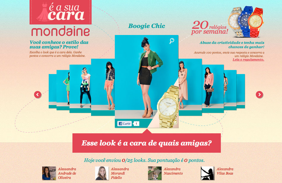 Hot-Site desenvolvido para a marca Mondaine, onde o usuário indicava looks para seus amigos do Facebook e os mesmos respondiam se era sua cara, ou não. Fui responsável pelo backend do projeto, mas acompanhei todas as etapas do desenvolvimento. O maior desafio foi tornar a mecânica competitiva. A campanha durou 4 semanas e a cada semana, era necessário alterar as regras do jogo, pois o engajamento foi muito grande o que acabava resultando em empates.