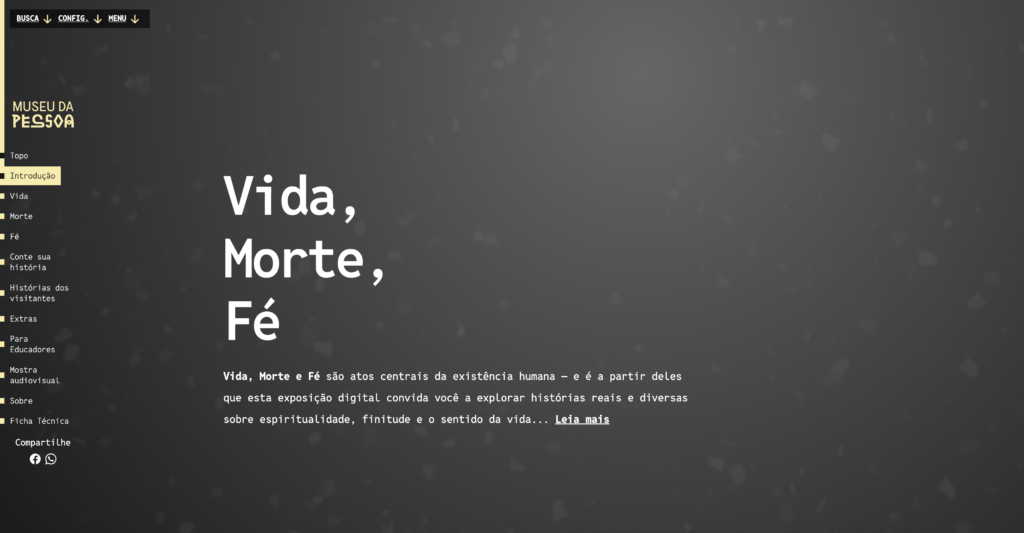 Desenvolvimento completo da exposição digital “Vida, Morte e Fé”, realizada em PHP e JavaScript. O projeto combina uma abordagem visual ousada e interativa com uma experiência imersiva e acessível.